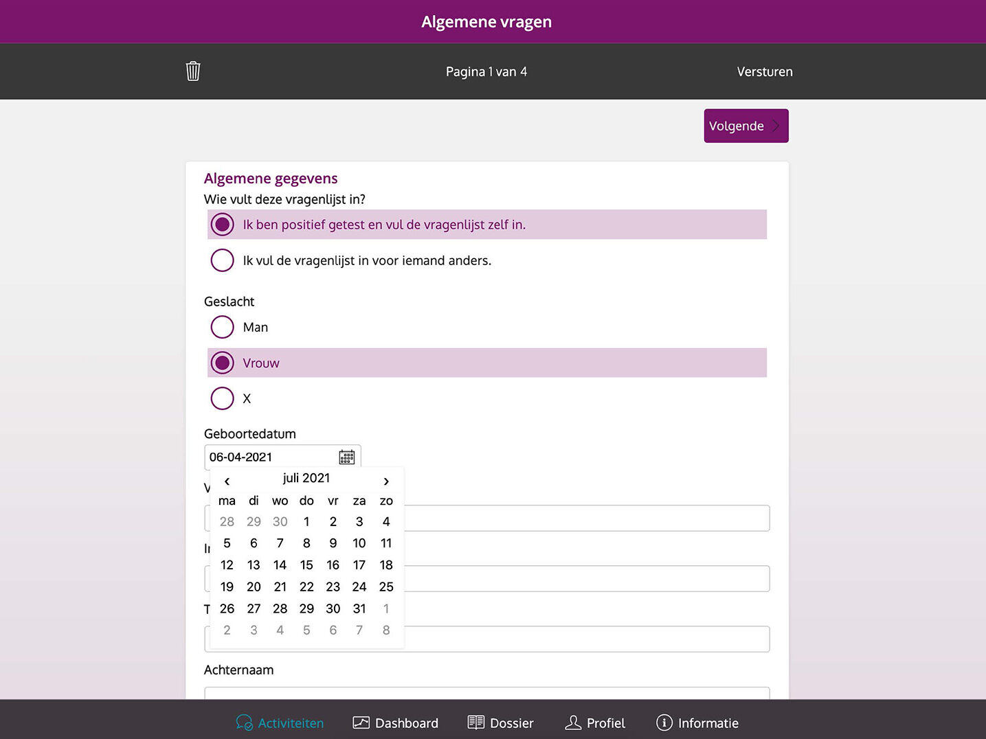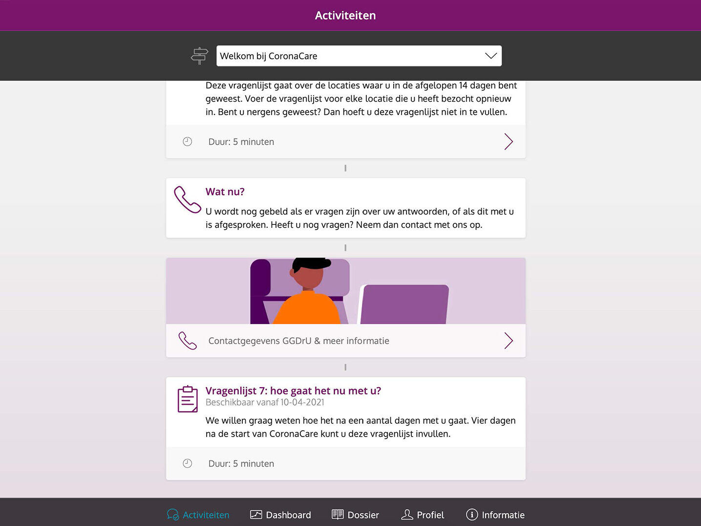 - For patients who are not able to use the computer, GGD staff offered phone support, whereby they filled out the questionnaires in the environment together with the patient.